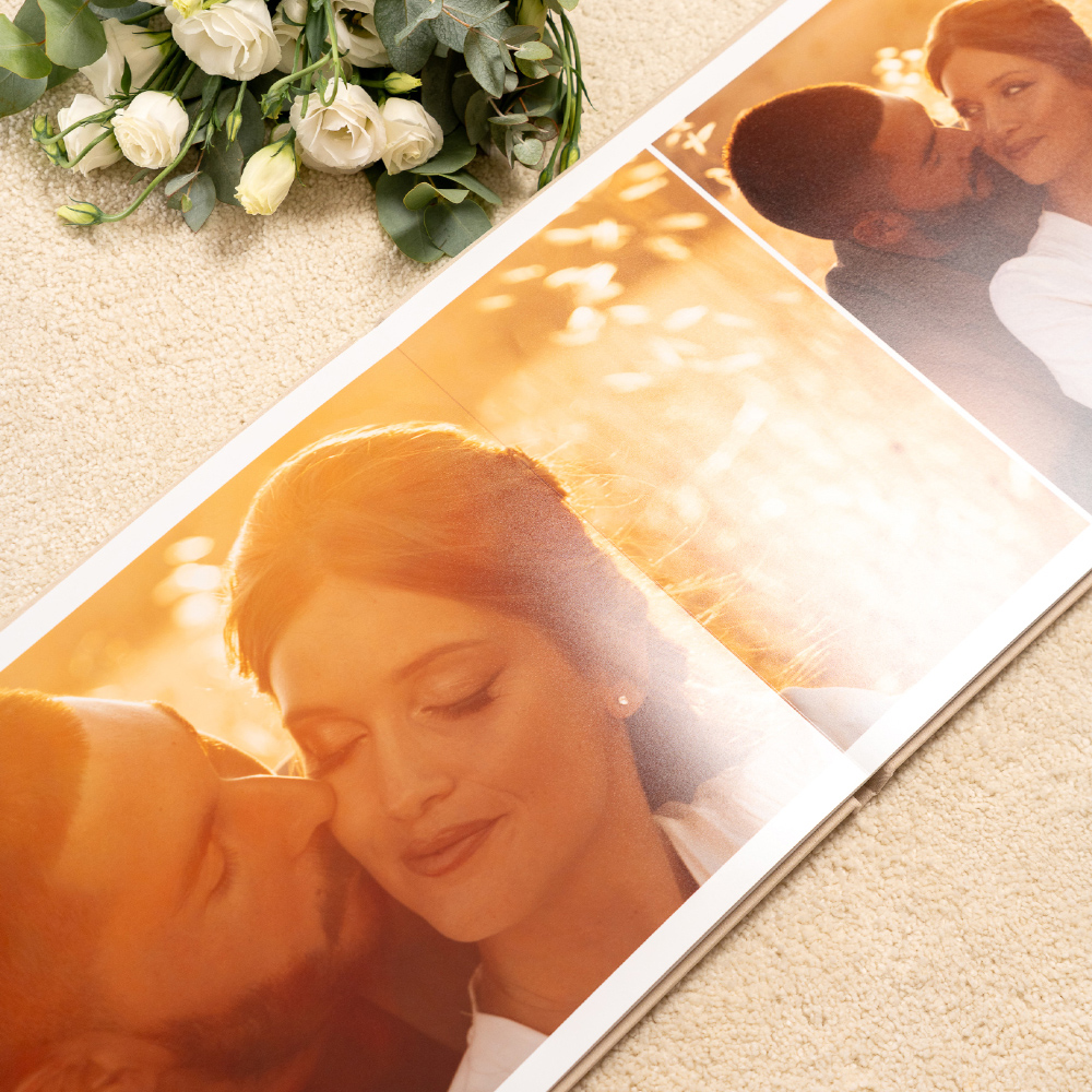 No modelo Cameo, a capa abre uma janela para a emoção. A tua fotografia favorita é integrada de forma permanente na capa em tecido, criando um leve relevo que a transforma no coração do álbum e num convite imediato para descobrir as memórias que guarda no interior.